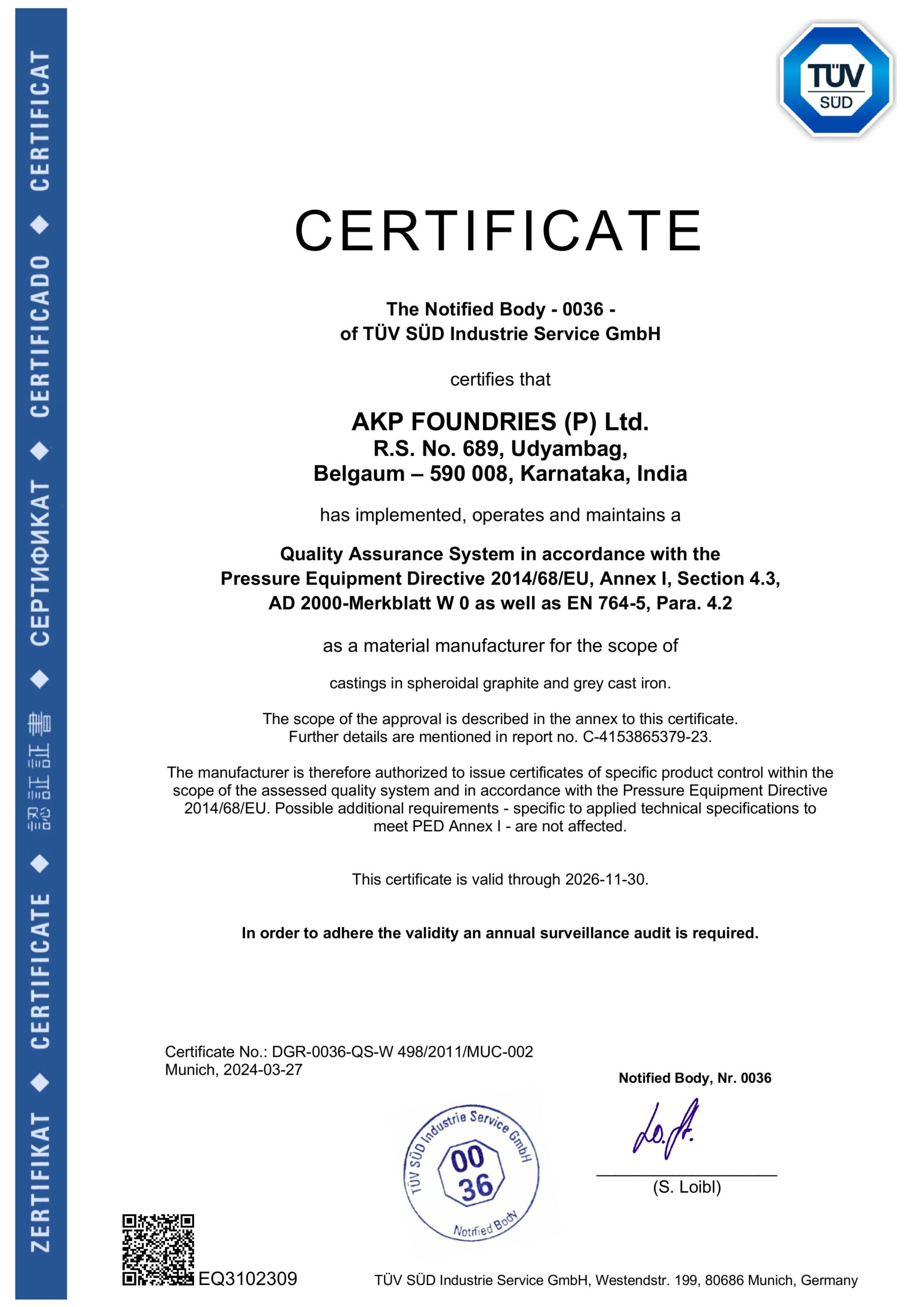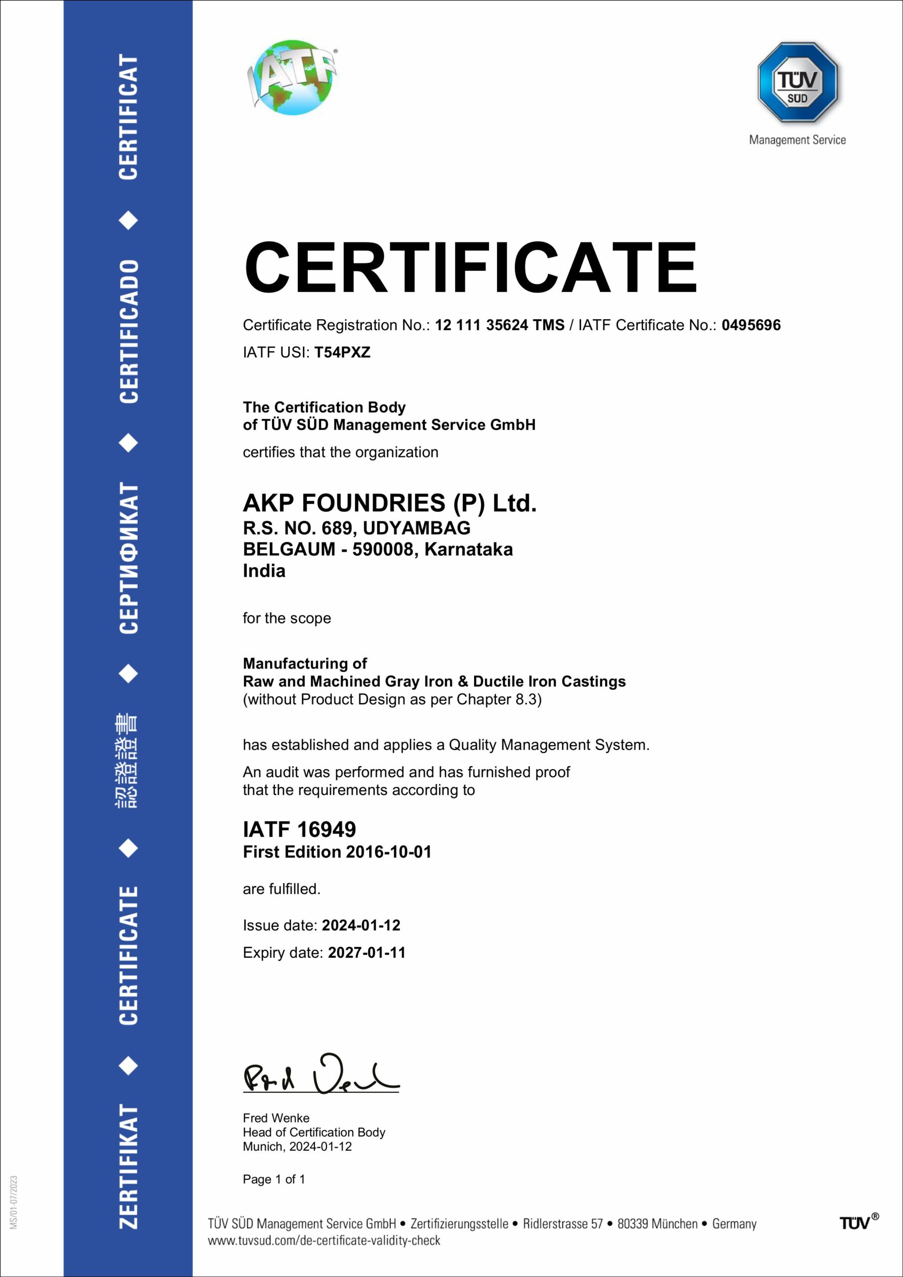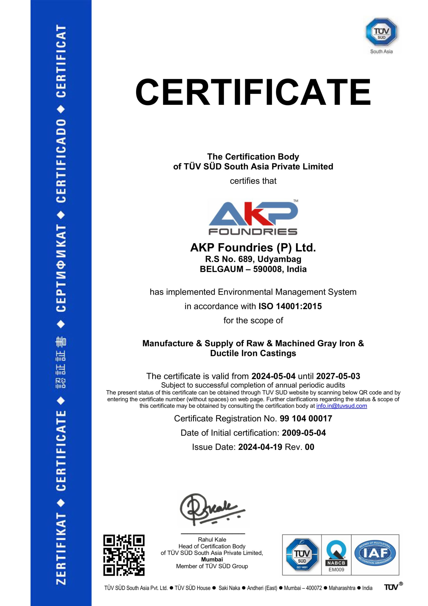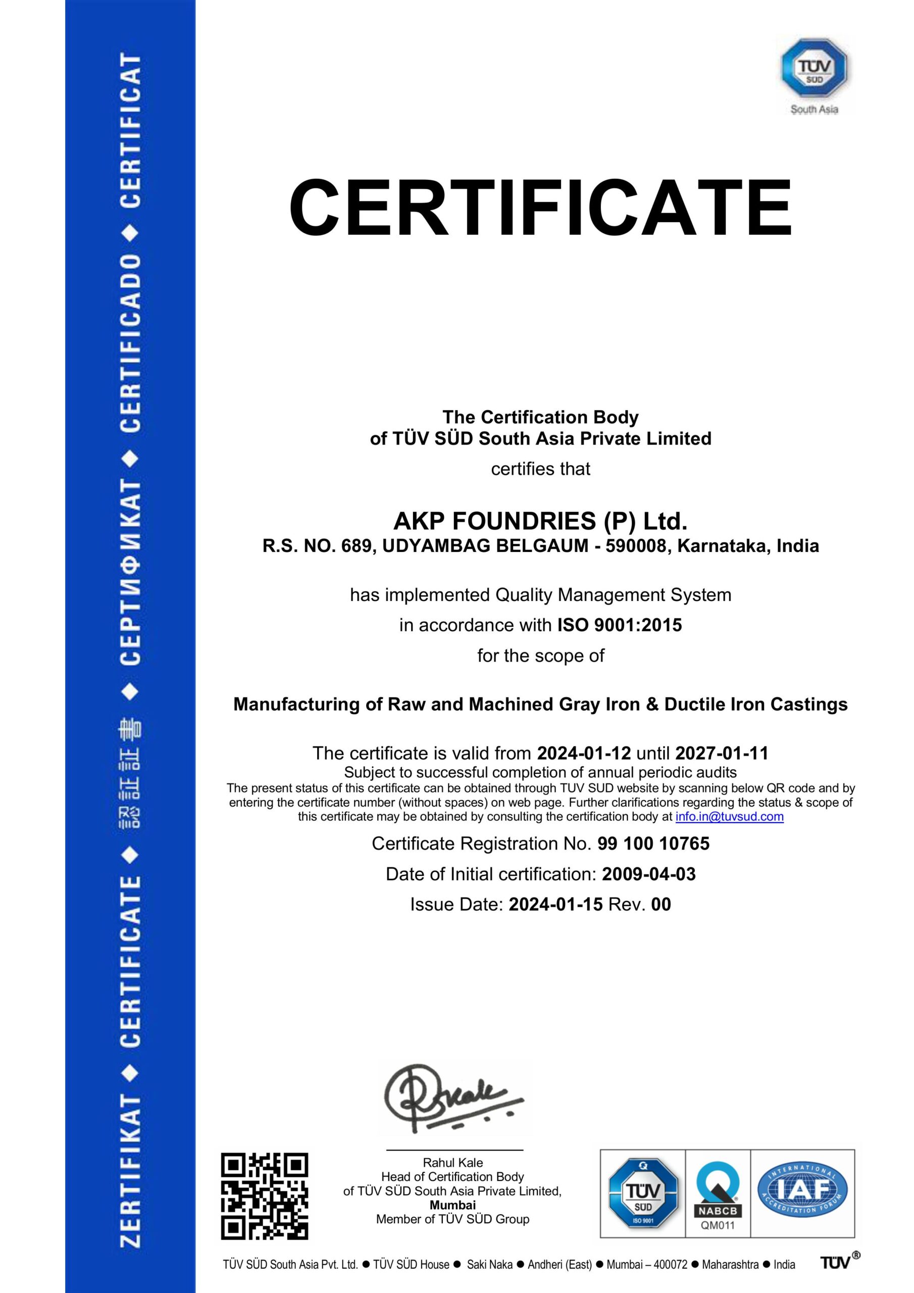 AKP Foundries has taken the time to not only acquire Occupational Safety, Quality Assurance Management certifications so that we can provide trusted services around the globe.
